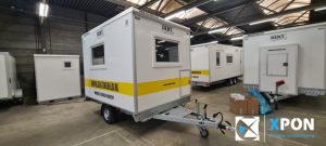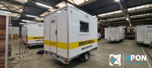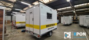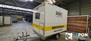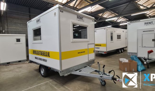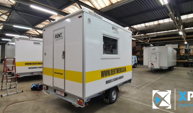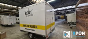 Mobiele badkamer belettering Op deze verhuur mobiele badkamer hebben wij de herkenbare Rentwereld huisstijl signing aangebracht.