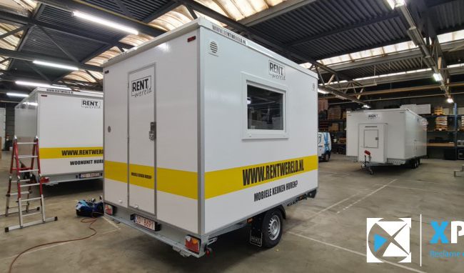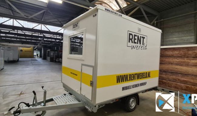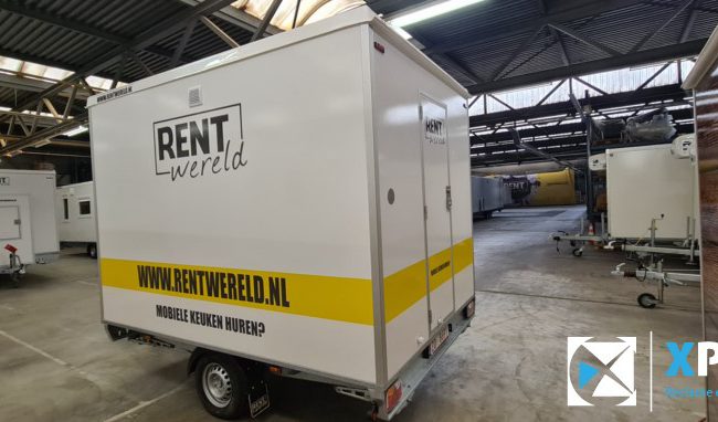 Verhuur mobiele keuken belettering Op deze verhuur mobiele keuken hebben wij de herkenbare Rentwereld huisstijl signing aangebracht.